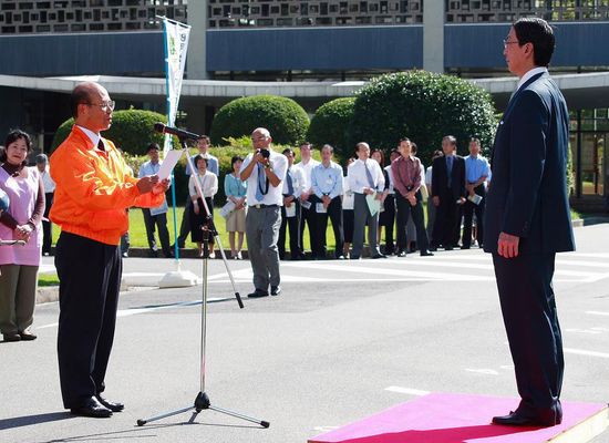 広島県は20日、「団塊の世代」や高齢者にボランティアなど社会参加を呼び掛けるキャンペーンの開始式を広島市中区の県庁で開いた。ポスターの掲示やリーフレット配布を通じて、地域社会への積極的な参画を促す。キャンペーンは初の取り組みで、開始式には県職員ら約120人が出席した。ウオーキングを兼ねた防犯パトロールをする廿日市市老人クラブ大野支部万年青会連合会などが、活動内容などを紹介した。